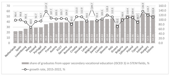 Share and growth rate of graduates from upper secondary vocational education (ISCED 3) in STEM fields, % (2015–2022) *. * Calculated based on the data: [].