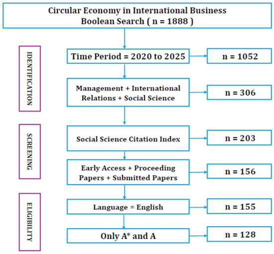 During abstract screening, a gap was identified in the literature on IB and the CE. To confirm the limited literature on IB, a Boolean search using “circular economy” and “sustainability” yielded 1888 research articles. After applying publication criteria, 1052 articles remained. The 2020–2025 period was chosen to capture the real impact of post-COVID research. Further identification was conducted using subject criteria in management, social science, and international relations to ensure alignment with the chosen topic. The quality of the articles was further validated using the SSCI, which identified 203 SSCI-indexed articles from over 3400 scholarly journals, providing access to an extensive repository of social science research. The screening process included early-access articles, proceedings, and submitted papers to ensure research quality, culminating in 156 articles. Eligibility was confirmed using the language criterion “English,” resulting in 155 articles. Finally, only A*- and A-ranked journals were selected from the Australian Business Deans Council (ABDC) journal rankings, yielding 128 articles (Figure 2).