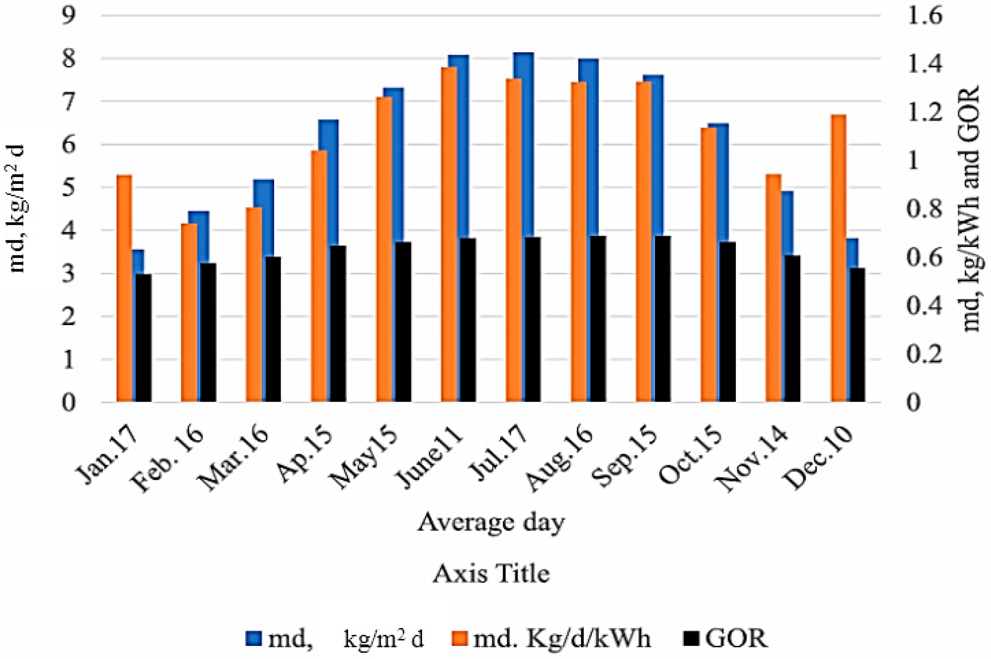 | Dayem (2023) [58] | Solar natural vacuum desalination (SNVD) | Waste heat utilisation | Daily production, GOR | 6.2 L/m2 day; GOR: 0.63. |