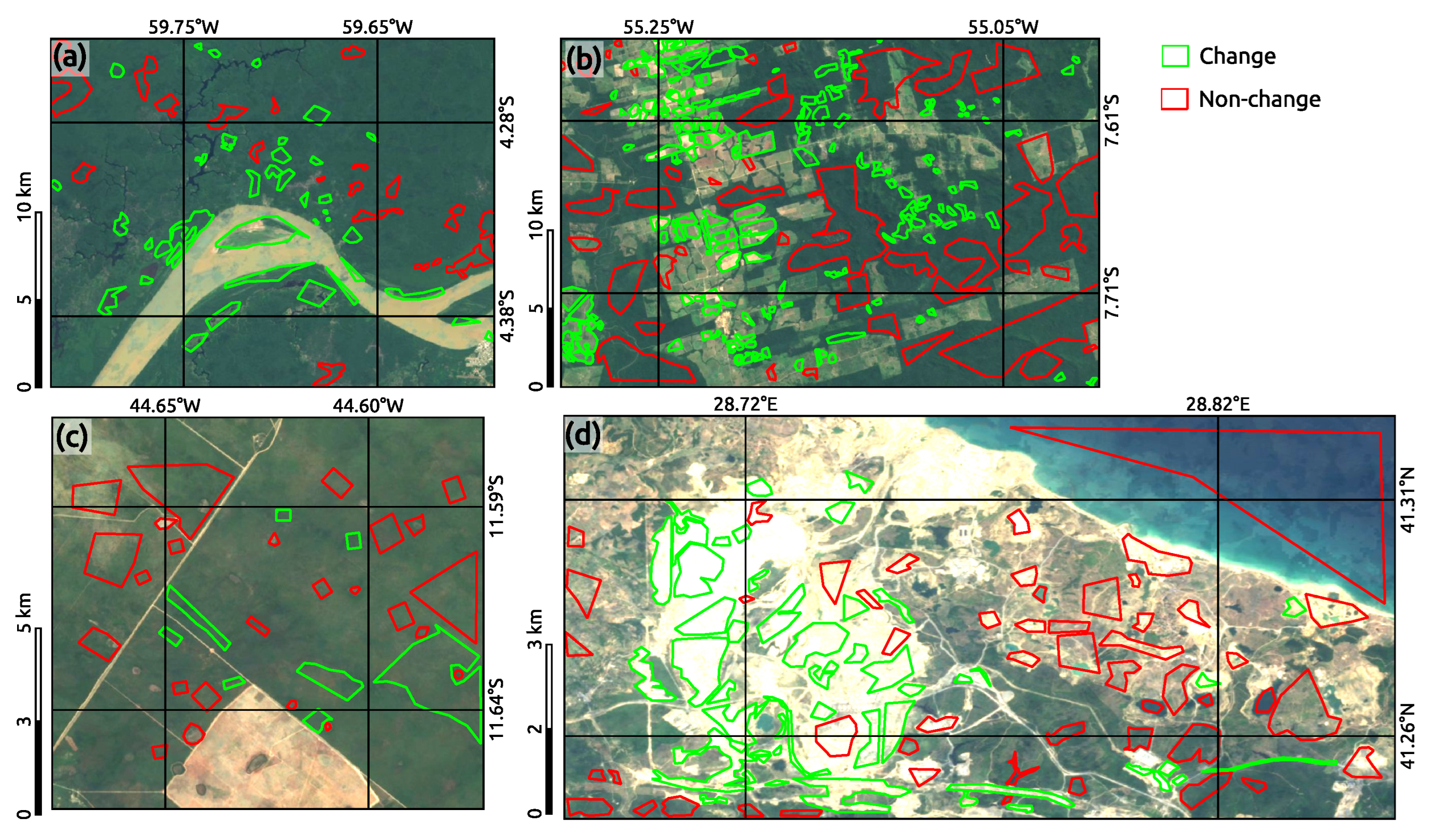 - Lei, G.; Li, A.; Bian, J.; Naboureh, A.; Zhang, Z.; Nan, X. A Simple and Automatic Method for Detecting Large-Scale Land Cover Changes Without Training Data. IEEE J. Sel. Top. Appl. Earth Obs. Remote Sens. 2023, 16, 7276–7292. [Google Scholar] [CrossRef]