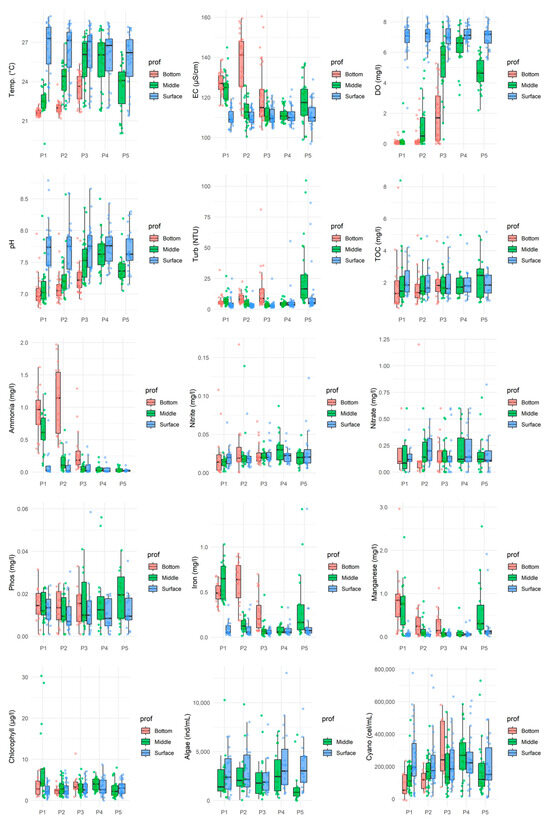 Data analysis (Figure 2 and Figure 3) revealed greater temporal than spatial variability in the surface water quality of the João Leite Reservoir during the monitored period. While the parameters assessed at the surface remained consistent across sampling locations and typically complied with regulatory limits [33], temporal fluctuations indicated apparent seasonality in water quality. Surface dissolved oxygen (DO) levels generally complied with regulations, remaining above 5 mg/L O2 and typically ranging between 5 and 8 mg/L O2, although an exception (2.34 mg/L O2) was recorded in July 2016 at point P01. DO decreased with depth, with many points indicating anoxia near the bottom, and showed temporal variations, particularly during the dry months of June and July 2016 (Times 18 and 19). The pH values consistently fell within the 7 to 8.5 range, meeting the legal limit (6 to 9 [34]), and predominantly showed neutral characteristics with a trend towards alkalinity; slightly lower values were observed in the middle and bottom layers (as defined in Figure 1) [35]. Electrical conductivity (EC) varied between 100 and 130 µS/cm, with maximum concentrations occurring predominantly in the lower section and during dry periods, decreasing during rainy seasons. Notably, values exceeding 100 µS/cm were recorded in both dry and rainy periods [36].