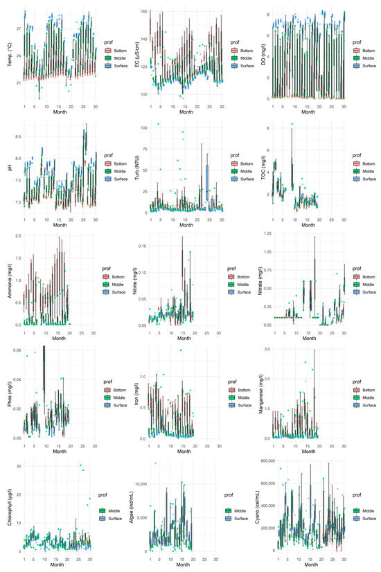 Boxplots show the distribution of water quality parameters across all monitored months at three depths (Bottom, Middle, Surface). Individual green points represent the raw measured values at each sampling occasion.