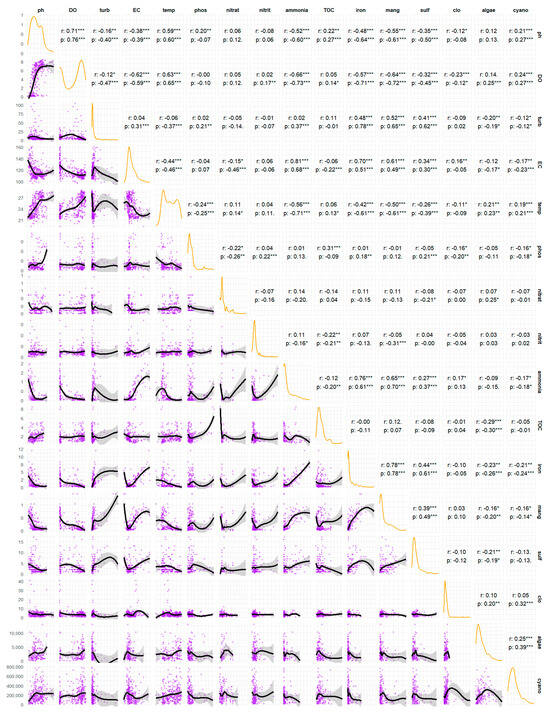 Figure 4 presents a correlation matrix that examines the inter-relationships between 16 water quality parameters. The matrix comprises three analytical components: the distributions of each variable along the diagonal, the scatter plots in the lower triangle, and the coefficients for both Pearson’s (r), which measures linear relationships, and Spearman’s (ρ), which measures monotonic relationships, in the upper triangle.