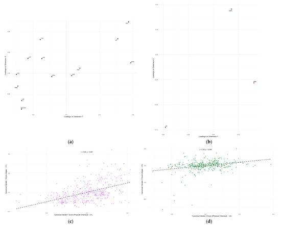 The loading plots of the physicochemical and biological variables function as a map, establishing the meaning of each canonical axis. Once the nature of these axes is established, the canonical score plots serve as the visual proof of the correlation between them (Figure 7c,d).