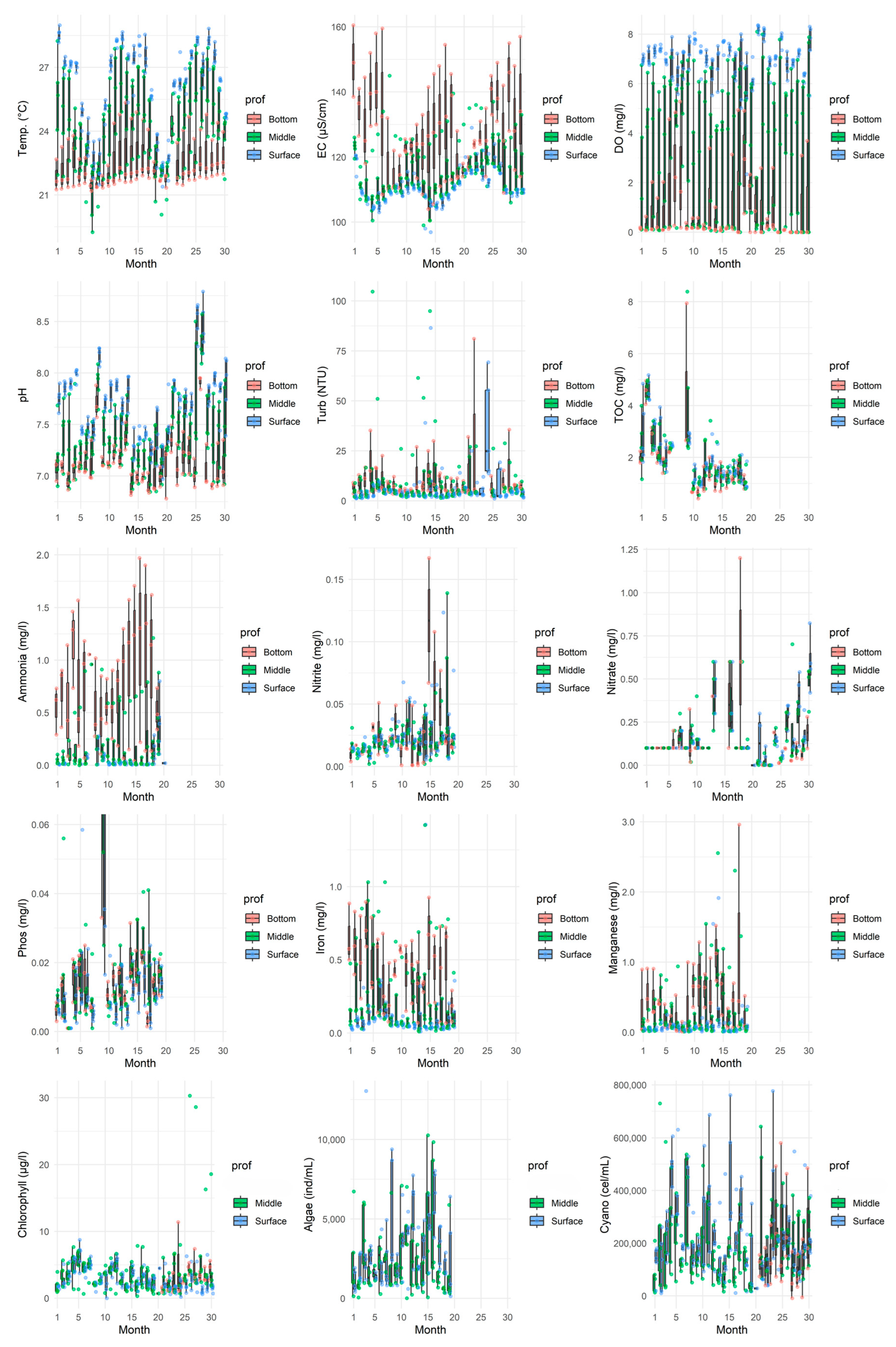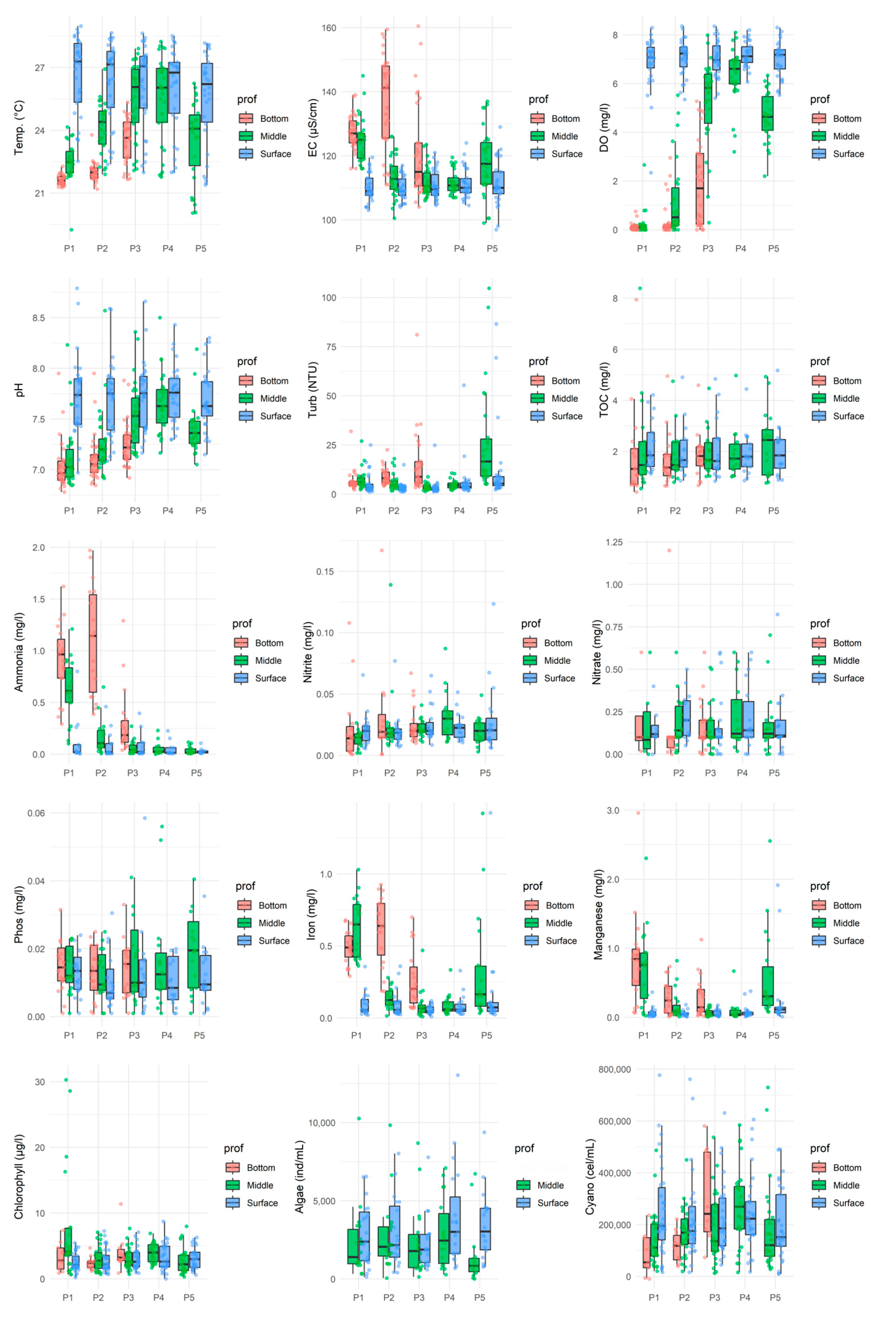 2.4. Physico-Chemical and Biological Variables of Water Quality