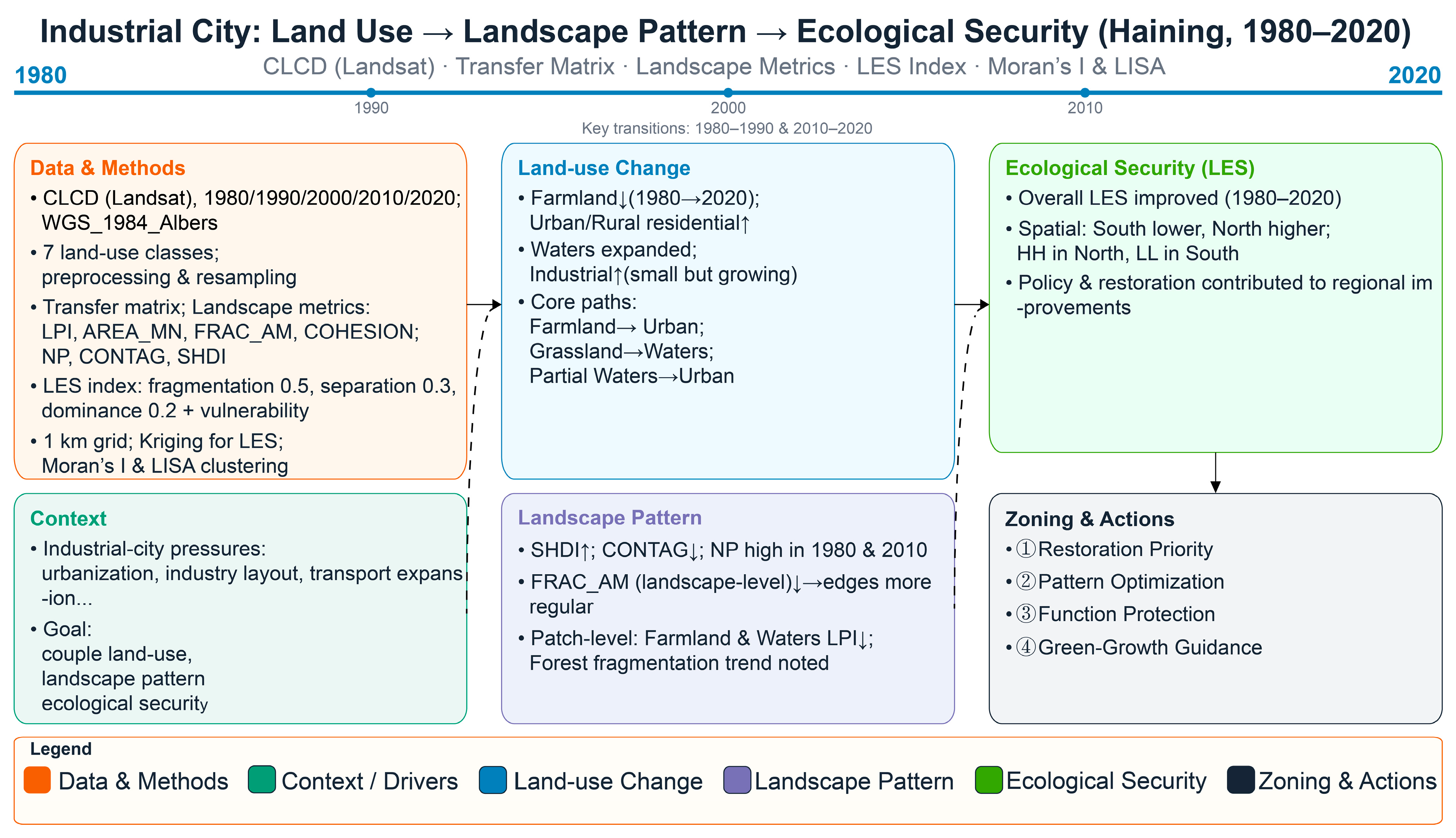 - From 1980 to 2020, the evolution of Haining’s landscape pattern demonstrated the typical characteristics of a rapidly industrializing city. At the patch scale, most land types, except for farmland, exhibited trends of high fragmentation, simplified morphology, and declining ecological stability, while farmland and water areas maintained their dominant positions and leading roles. At the landscape scale, the diversity of landscape types increased, and both fragmentation and contagion indices decreased, indicating that the spatial organization of land use was gradually optimized. These changes correspond to the implementation of land management policies and ecological governance measures at different stages, suggesting that policy interventions can substantially enhance regional ecological security. Based on this case study, similar industrial cities aiming to improve their ecological security levels should take blue-green corridors and ecological core patches as the structural framework to limit the fragmentation of conversion corridors for construction land while prioritizing cross-regional connectivity and the continuity of riparian buffer zones to strengthen regional ecological security. It is particularly important to enhance the spatial connectivity of landscape patterns in industrial cities, as such connectivity plays a key role in supporting ecological optimization processes, mitigating habitat isolation, and promoting sustainable urban development.