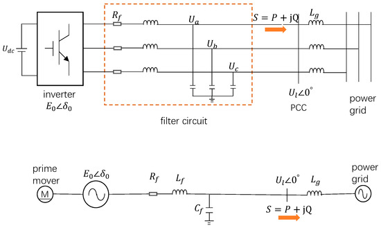 where represents the filtering resistance, represents the filtering inductance, represents the grid-side voltage, and represents the output voltage of the inverter.