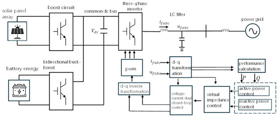 With the deep implementation of the “dual carbon” strategic goals, renewable energy sources such as photovoltaic power are replacing traditional fossil energy at an unprecedented speed [1]. Currently, it is common to combine photovoltaic units and energy storage to form a photovoltaic-storage system. In this system, when the photovoltaic unit cannot meet the load demand, the energy storage device can be charged and discharged to maintain the stability of the power supply, improving the flexibility of the system [2,3]. This is because the renewable energy generation units generally cannot provide the crucial inertia support and damping effect like traditional synchronous generators (SGs) to the power grid [4]. To address this issue, domestic and foreign scholars have proposed the concept of grid-forming [3,5,6]. Among them, the VSG is widely used. This control enables renewable energy to provide J and D to the power grid like traditional synchronous motors, thereby aligning the relationship between distributed power sources and the power grid and improving the stability of the future power grid [7,8]. However, the traditional VSG has constant J and D values based on the reference SG, making it difficult to adapt to the dynamic requirements of the power system. To enhance the adaptability of the VSG, some scholars have proposed applying ACL to the VSG strategy [9].