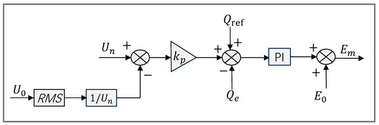 To simulate the reactive power–voltage regulation of the synchronous generator, the virtual excitation voltage needs to be adjusted in the VSG. Since the subsequent double closed-loop control uses normalized quantities for calculation, the control of should be based on normalized values.