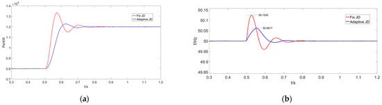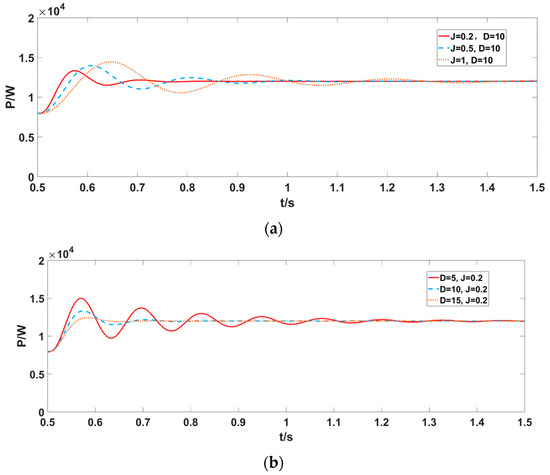 (a) When D = 10 N·m·s/rad, the output active power is shown under different J values; (b) When J = 0.2 kg·m2, the output active power is shown under different D values.