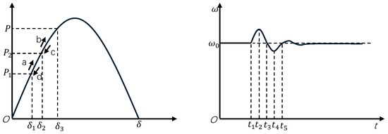 Figure 7 illustrates the power-angle and frequency-oscillation curves of the synchronous generator; when the load is engaged, the active power of the synchronous generator increases from P1 to P2. The oscillation period is divided into four intervals: a: t1–t2, b: t2–t3, c: t3–t4, and d: t4–t5. The following is an analysis of these four intervals. In interval a (t1–t2), the active power increases, the rotor accelerates, increases, and suddenly rises to a peak and then decreases. The main task in this interval is to reduce the angular velocity , so J needs to be increased. However, since J cannot be too large, an upper limit value should be set. In interval b (t2–t3), < 0, begins to decrease, but is still greater than . At this time, a larger D can effectively reduce , and a smaller J is used. For the convenience of simulation, J remains a fixed value in this interval. The values of J and D in intervals c and d are set in reference to intervals a and b.
