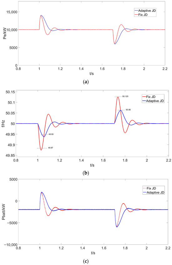 Figure 9 compares the conventional VSG strategy with the adaptive inertia- and damping-adjusted VSG strategy under load-switching disturbances in the PV-storage grid-forming system. Under a 4 kW disturbance in load switching, as shown in Figure 9a, and under the strategy proposed, the output power of the inverter shows a faster stabilization speed and a smaller power fluctuation value compared to the fixed JD strategy. As shown in Figure 9b, under the function strategy proposed, during the load input and removal, the frequency shows a faster recovery to the rated value compared to the fixed JD strategy, and the overshoot during the oscillation process is significantly smaller. From the data marked in the figure, it can be obtained that compared with the fixed JD strategy, this proposed strategy reduces the frequency overshoot by approximately 46% during load input and by approximately 52% during load removal. And the overshoot in both cases is within 0.02 Hz. Thus, it can be inferred that when encountering larger load switching, the frequency change can remain within the specified ±0.5 Hz range. Figure 9c shows the of the energy storage battery during the disturbance process. In the initial stage, it is in a state of absorbing electrical energy. Subsequently, as the load switching occurs, it changes.