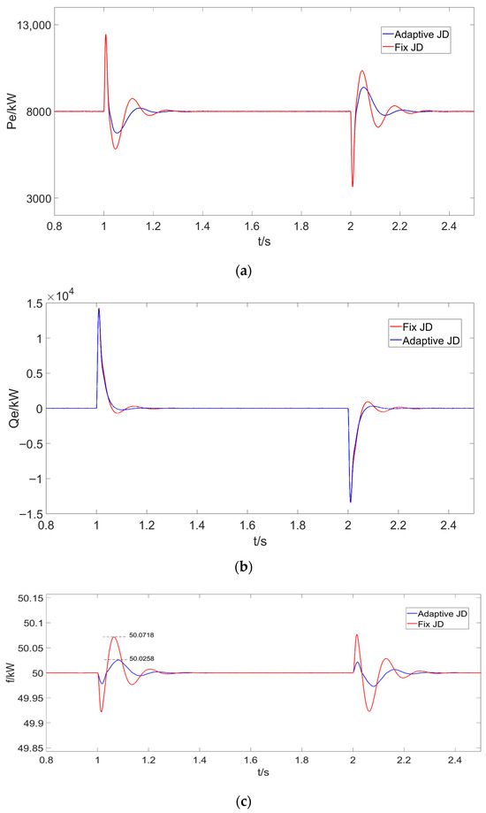 Equation (14) shows that, for a fixed D, raising J lowers the damping ratio, enlarges overshoot, and stretches both settling time and recovery after any power change; keeping J constant and increasing D, in contrast, raises the ratio, suppresses overshoot, and shortens settling time. Hence, J sets the oscillation frequency while D governs how fast the oscillation dies away. To keep the damping ratio high, J should stay small—an excessive value amplifies oscillation—whereas D should be as large as practicable, because a higher D yields stronger damping and better transient performance [20].