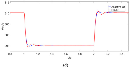 Figure 10 compares the conventional VSG strategy with the adaptive inertia- and damping-adjusted VSG strategy under grid-side voltage disturbances in the PV-storage grid-forming system. Under the disturbance of the 1 s–2 s grid-side voltage drop, as shown in Figure 10a,b, the proposed strategy enhances both the regulation speed and the reduction of overshoot in the VSG’s active and reactive power outputs. As shown in Figure 10c, the system frequency overshoot is reduced by approximately 64% compared with the fixed JD strategy. As shown in Figure 10d, the output voltage of the VSG returns to the initial voltage after the disturbance, which verifies the one-time voltage regulation capability of the VSG.