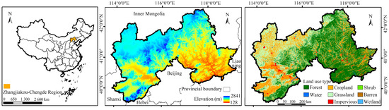 The Zhangjiakou–Chengde (ZC) region, located in northern Hebei Province (39°18′–42°37′ N, 113°50′–119°15′ E), covers approximately 7.63 × 104 km2 and functions as a key ecological barrier and water conservation zone for Beijing and Tianjin (Figure 1). The area is characterized by mountains, loess hills, and plateau landscapes, with a temperate continental monsoon climate. Mean annual precipitation ranges from 300 to 700 mm, and mean temperatures vary between −1 °C and 9 °C, creating strong spatial and temporal heterogeneity in ecosystem processes. As a typical agro-pastoral transition zone in northern China, the ZC region provides essential ecosystem services, including water retention, soil conservation, and carbon sequestration. However, the region is ecologically fragile and highly sensitive to environmental stressors. Water scarcity, overgrazing, and land degradation have long constrained ecological stability, while rapid socio-economic development—such as urban expansion, agricultural intensification, and infrastructure construction—has further altered land surface processes. These combined pressures not only affect NEP but also reshape the interaction between ecological functions and human activities.