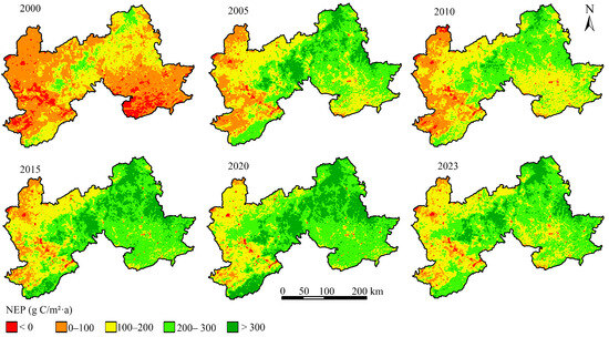 The NEP of the ZC region exhibited pronounced spatial heterogeneity and temporal dynamics from 2000 to 2023 (Figure 2). In the early 2000s, large areas in the western and southern zones showed low or even negative NEP values (<0 g C/m2·a), particularly in ecologically fragile regions with intensive human disturbance. By contrast, the northeastern and central mountainous areas maintained relatively high NEP values (>200 g C/m2·a), reflecting stronger vegetation productivity and carbon sequestration capacity. Over time, NEP in the ZC region showed a marked improvement, especially after 2010. Areas with low or negative NEP progressively diminished, while regions with higher NEP (>300 g C/m2·a) expanded, particularly in the northern and eastern ecological zones. This shift suggests significant ecological restoration efforts and improvements in vegetation growth conditions.