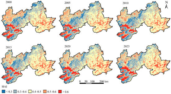 The HAI in the ZC region exhibited a clear upward trajectory from 2000 to 2023, with distinct spatial heterogeneity (Figure 4). In the early 2000s, areas of high HAI (>0.6) were concentrated around major urban centers and transportation corridors, particularly in the southern and southwestern parts of the region, reflecting the influence of dense population and economic activity. Conversely, large areas in the northern and eastern ecological zones maintained relatively low HAI values (<0.4), indicating weaker anthropogenic pressure. Over time, HAI expanded significantly across the region, with intensification in both urban and peri-urban areas. By 2023, zones of high HAI (>0.6) had markedly increased, extending into surrounding agricultural and transitional landscapes, while low-value areas (<0.3) became increasingly fragmented and confined to remote mountainous zones. This spatial expansion underscores the accelerating impacts of urbanization and land-use intensification.