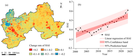 Temporal trends of HAI in the ZC region: (a) spatial distribution of HAI change rate, and (b) interannual variation and linear regression with 95% confidence and prediction bands.