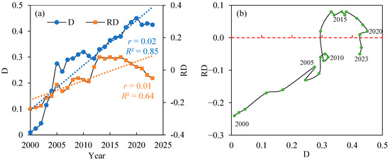 Temporal evolution of the coupling coordination degree (D) and relative development degree (RD) between NEP and HAI in the ZC region from 2000 to 2023: (a) interannual variations in D and RD, and (b) trajectory of D-RD coupling.