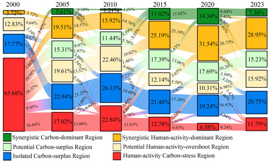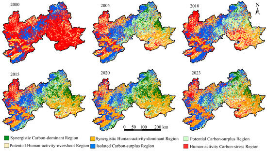 The spatial distribution of coupling coordination types (Figure 7) revealed strong spatial heterogeneity. In 2000, the region was predominantly classified as Human-activity Carbon-stress Regions, widely distributed across the central and southern zones. Over time, these areas significantly contracted, while Synergistic Human-activity-dominant Regions and Potential Human-activity-overshoot Regions gradually expanded. By 2023, large portions of the northern and eastern ecological zones had shifted into Synergistic Carbon-dominant Regions and Potential Carbon-surplus Regions, indicating ecological recovery and improved carbon sequestration in these areas.