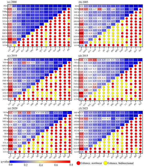 The explanatory power of different driving factors on the coupling coordination degree between NEP and HAI exhibited both consistent commonalities and notable temporal variations (Figure 9). Across all years, LUI remained the single most influential factor, with q-values generally above 0.30. This result underscores the persistent and dominant role of land-use patterns in determining the spatial differentiation of NEP–HAI coordination. Importantly, although LUI retained its leading position, its explanatory power showed a gradual decline from the early 2000s to 2023, reflecting the increasing role of natural and topographic constraints as ecosystems gradually recovered and human-nature interactions became more balanced.