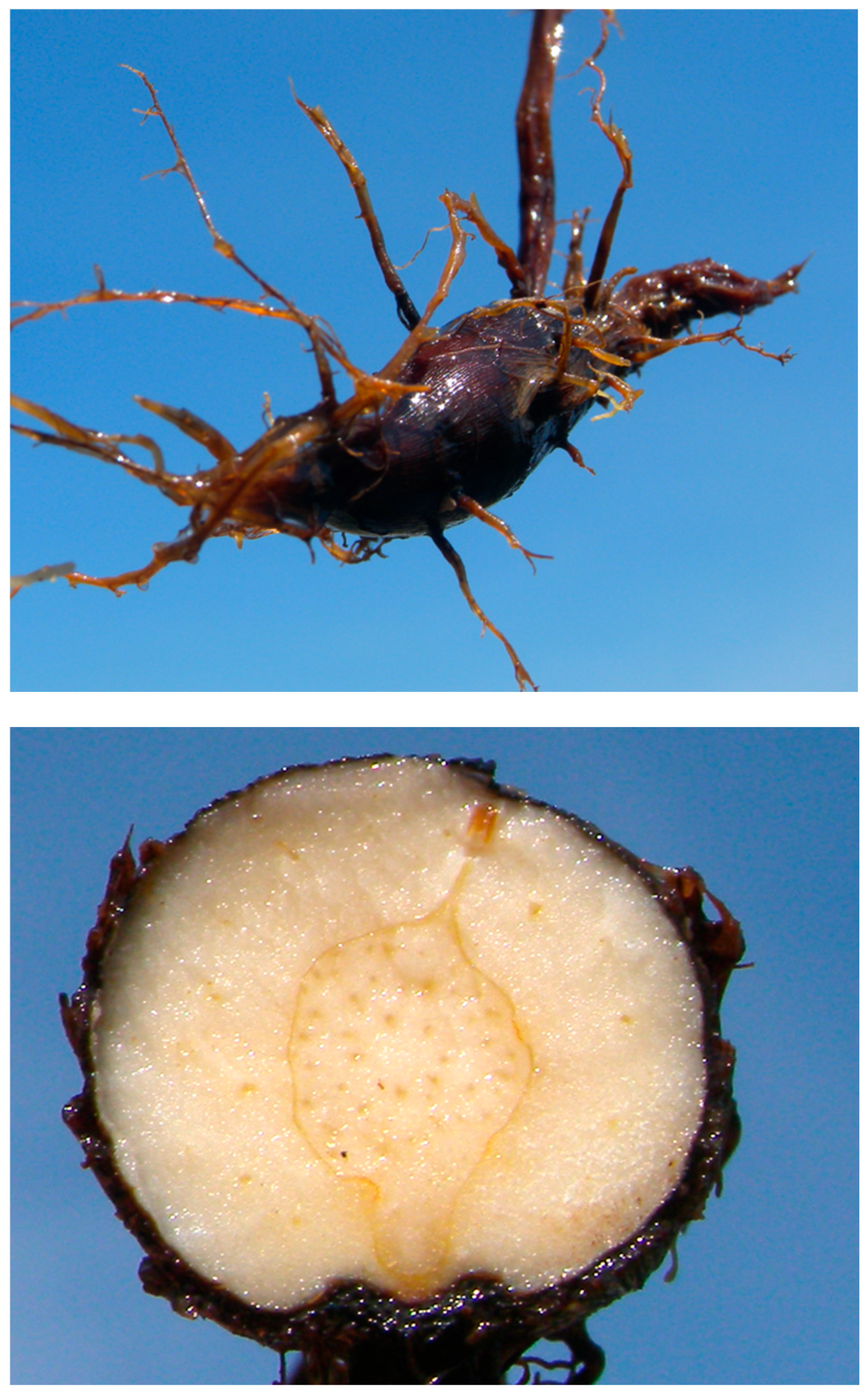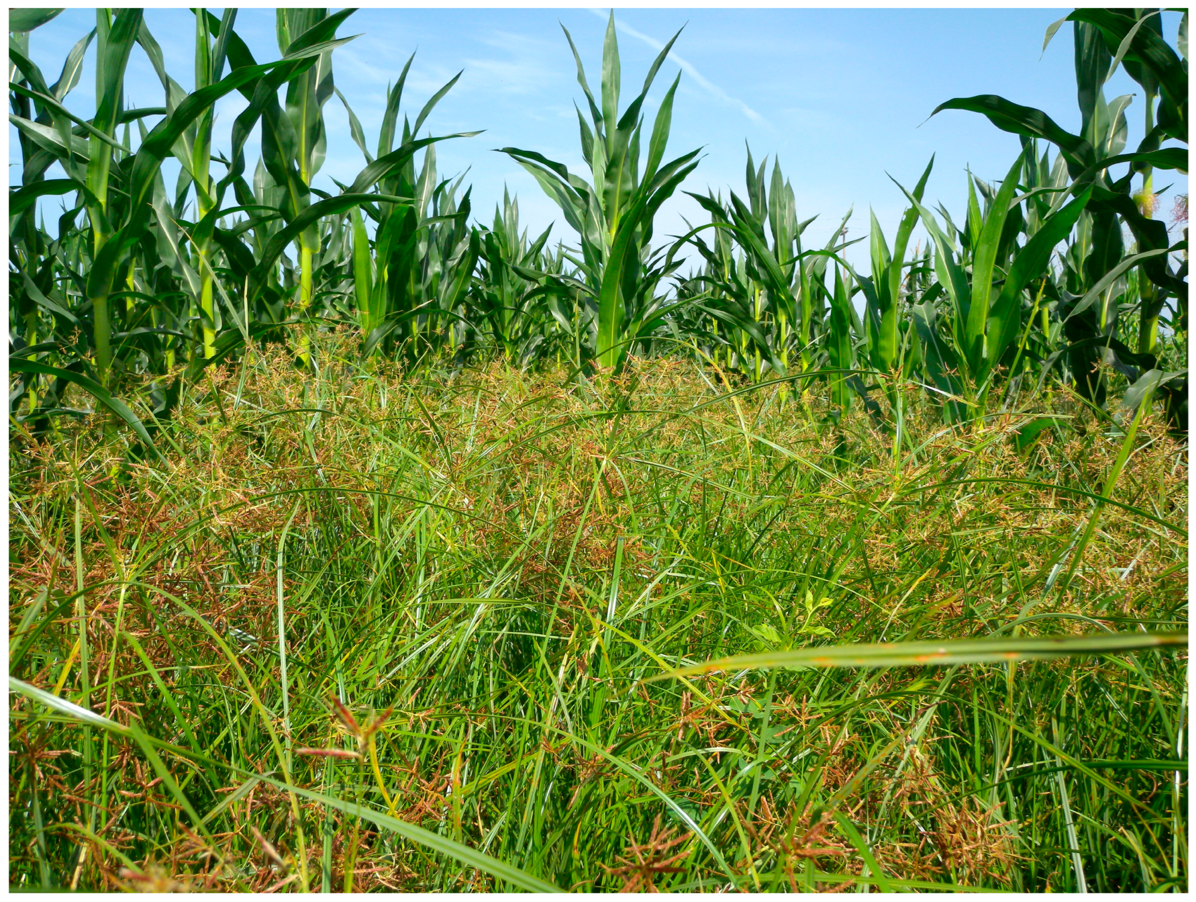 - Henry, G.M.; Elmore, M.T.; Gannon, T.W. Cyperus esculentus and Cyperus rotundus. In Biology and Management of Problematic Crop Weed Species; Academic Press: Cambridge, MA, USA, 2021; pp. 151–172. [Google Scholar]
