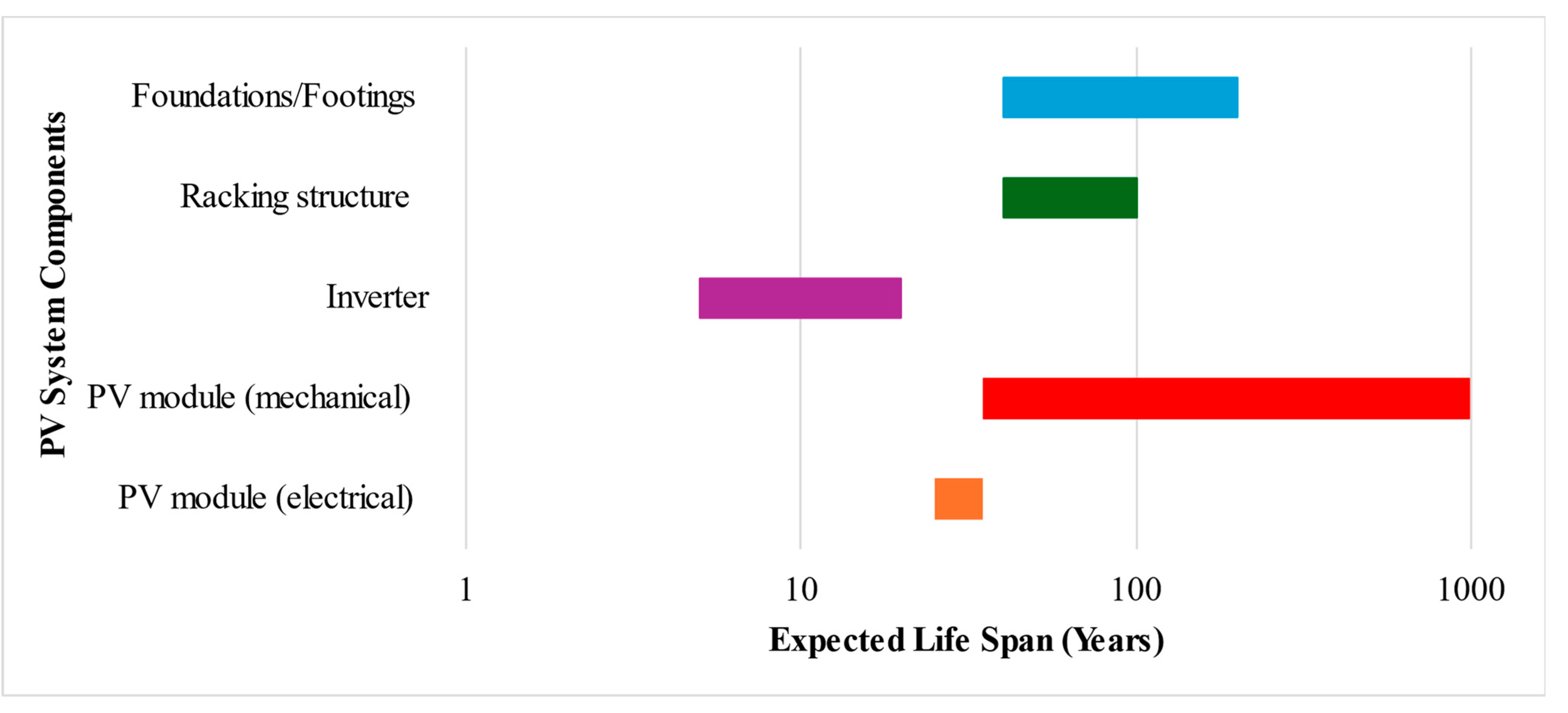 Figure 2 presents the range of lifetimes for key agrivoltaic system components. The inverter, as expected, demonstrates the shortest lifespan. PV modules and racking systems, however, remain structurally viable for shading even after their power-generating function diminishes or ceases. Based on this analysis, PV systems can continue to provide agronomic value in the form of passive shading for almost 100 years beyond inverter failure (Table 3). While tempered glass used in PV modules possesses the intrinsic durability to last for centuries, actual operational lifespan is typically constrained by encapsulant degradation—particularly delamination and adhesive failure [79,80].