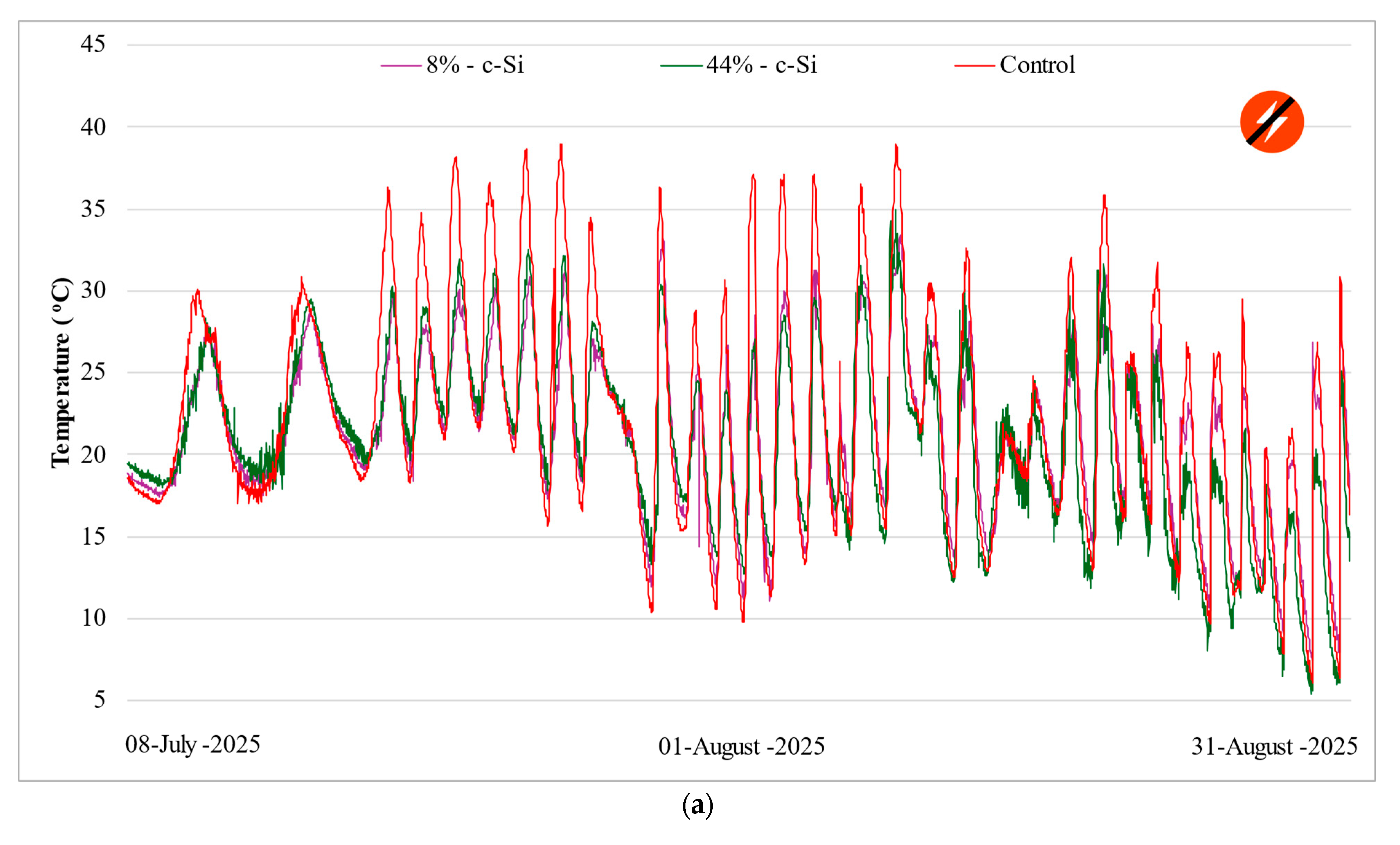 Significant soil temperature reductions were recorded beneath the 44% transparent PV modules in both powered and unpowered conditions (Figure 3). For the powered array, the mean soil temperature under the 44%-transparency modules was 20.7 °C, compared to 21.7 °C in the unshaded control. This represents an average reduction of 1.0 °C over the two-month measurement period, with a maximum instantaneous reduction of 5.0 °C. In addition, air temperature measurements indicated a cooling effect under the 44%-transparent c-Si modules, with a mean temperature of 21.8 °C, approximately 0.3 °C lower than the control (22.1 °C), and a maximum reduction of 6.8 °C during peak daytime conditions.