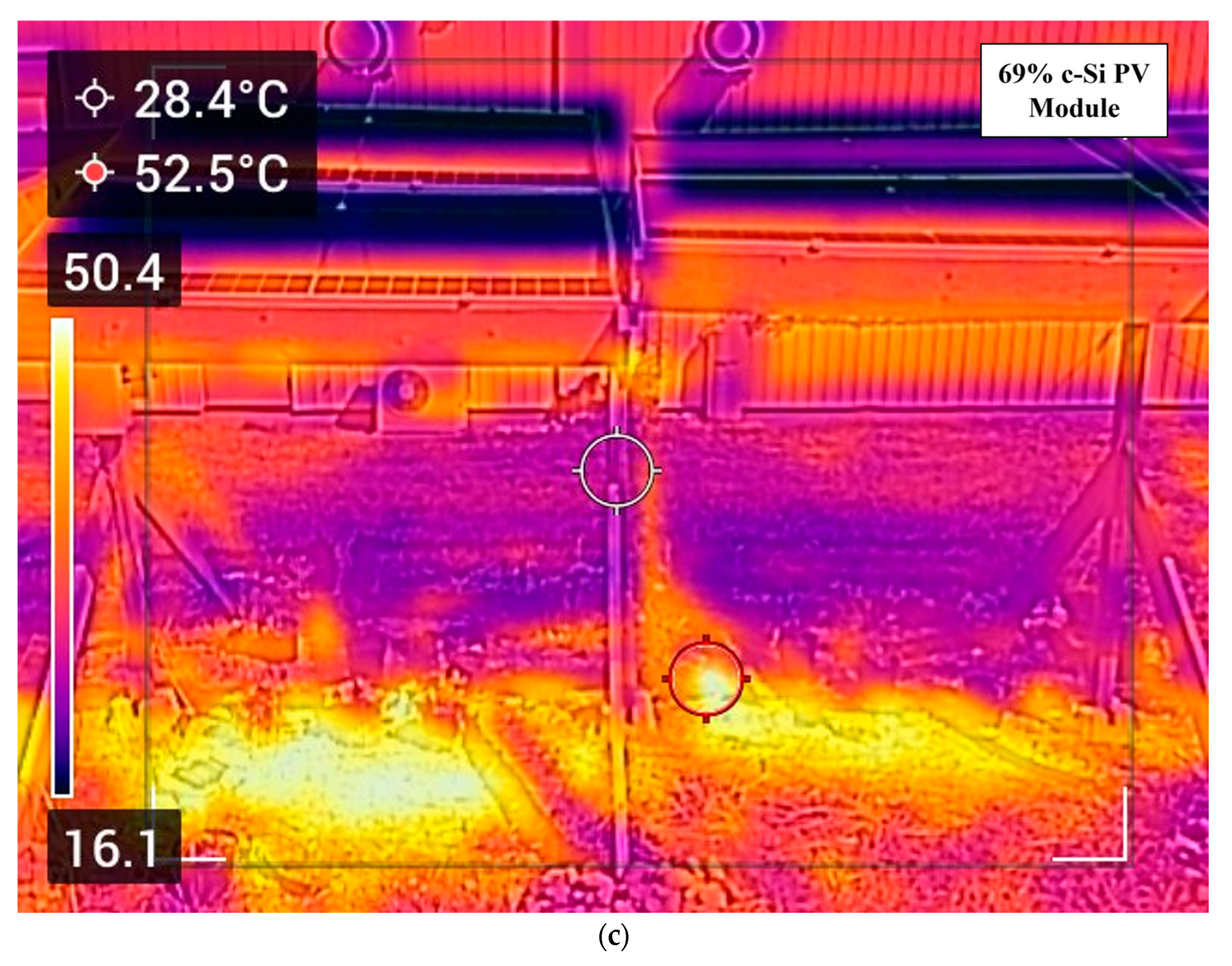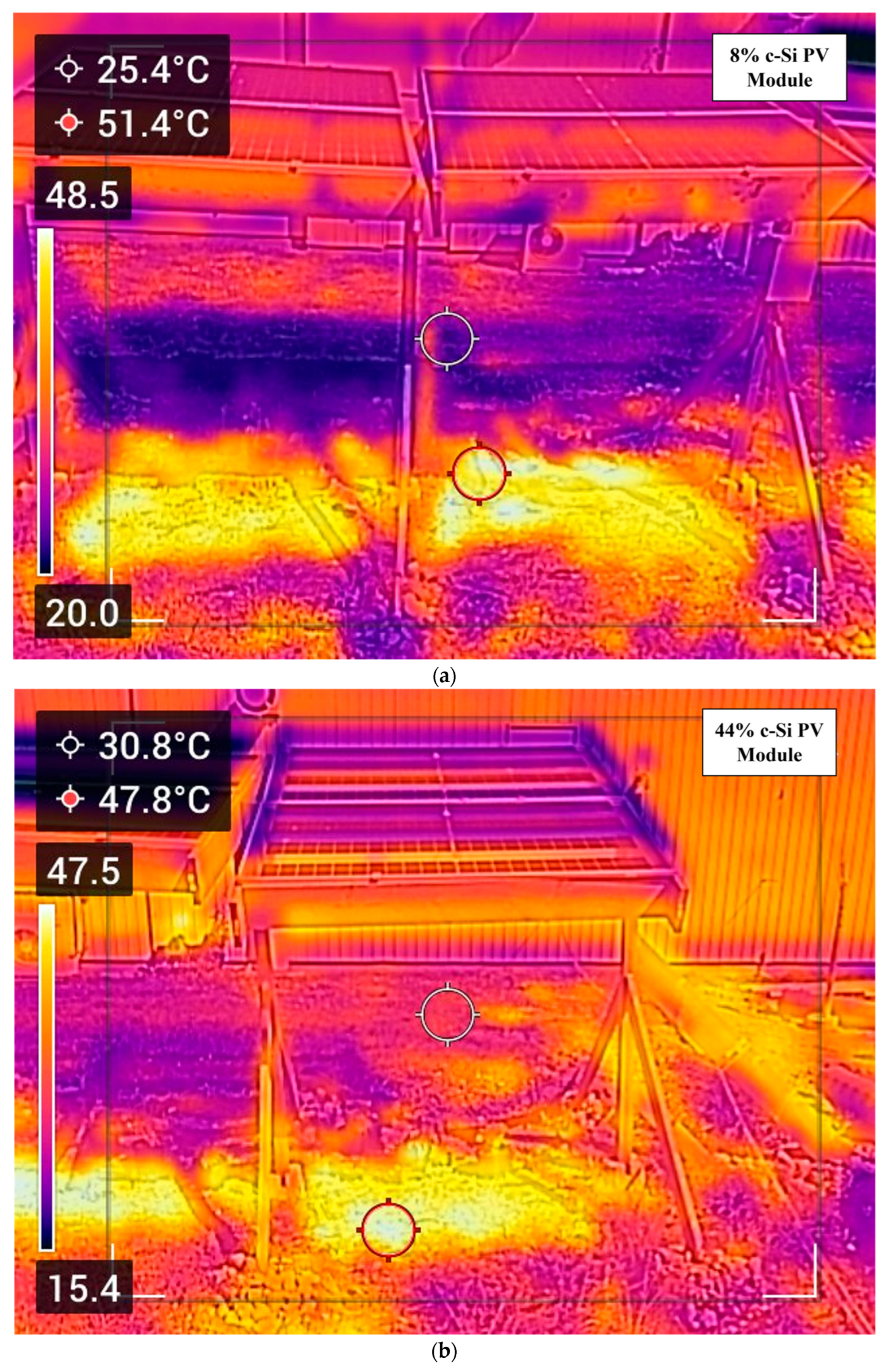 To further validate these findings, thermal imagery from the unpowered site is included (Figure 5), which visually illustrates the cooler soil surface temperatures beneath agrivoltaic modules compared to adjacent unshaded areas. For example, under the 8% c-Si PV modules, the temperature under the shade is approximately 20 °C as compared to around 40 °C on the outside.