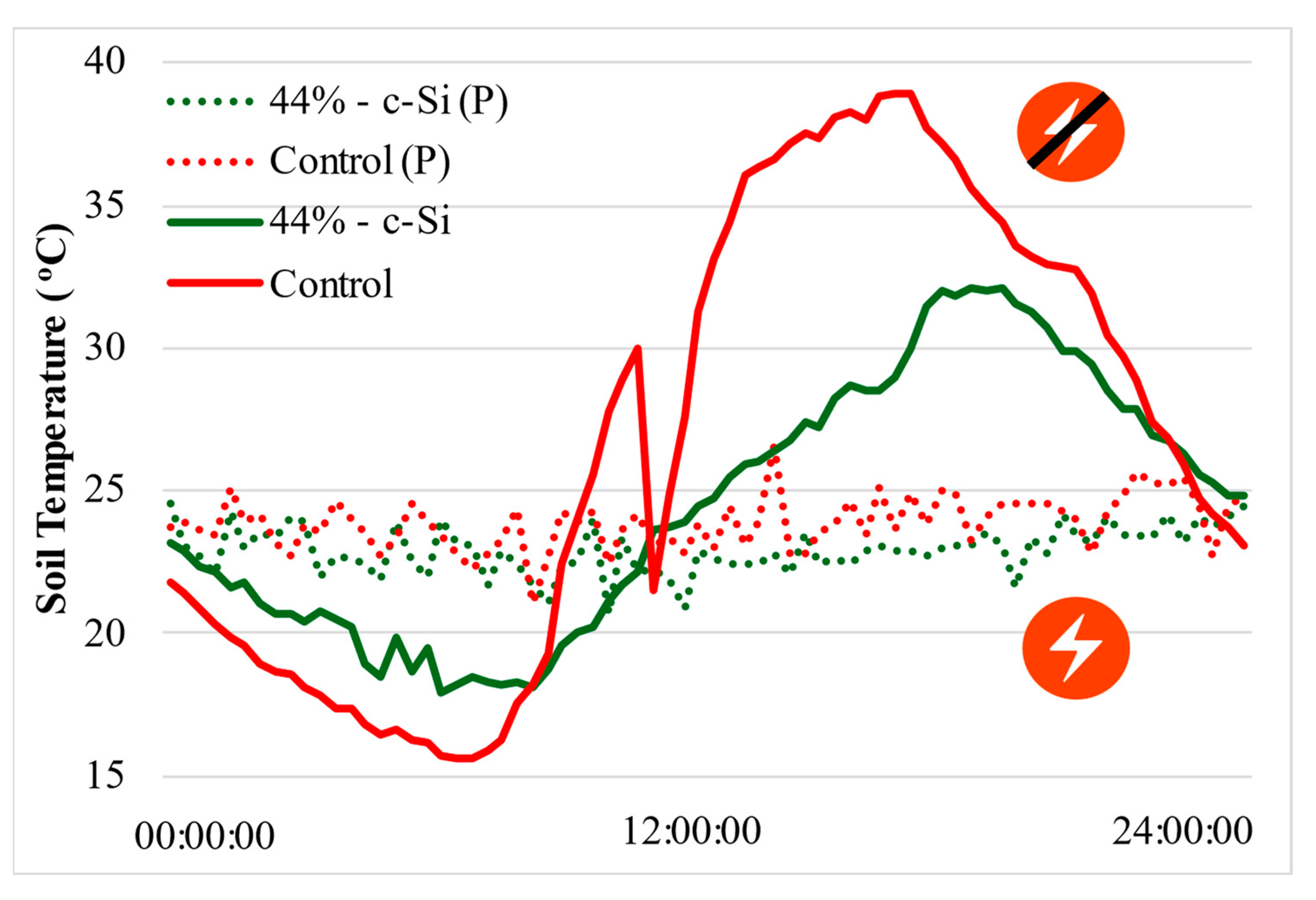 Figure 6. Soil temperature variation over a single day under 44% c-Si PV modules and control (unshaded) conditions for both powered and unpowered systems. The legend indicates powered system measurements with “(P)”; shading effects are more pronounced in the unpowered system.