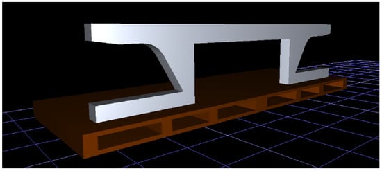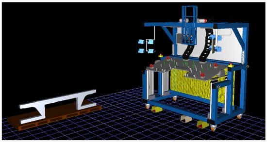 The project began by modeling the work environment in which the worker would perform the assembly operation. First, two standard-size Euro pallets (1200 mm × 800 mm) from the Tecnomatix Jack software library were inserted into the workspace and the created component was placed onto them. This component was converted into the .jt format to enable its insertion into the software environment. The individual parts were positioned using the “Move” command and by dragging them with the mouse. Their precise positions were subsequently defined using the “Snap” command, selecting the appropriate options as needed, such as face position, face orientation, face center, and face plane. The modeled component inserted into Tecnomatix Jack software is shown in Figure 4.
