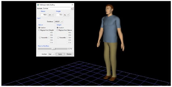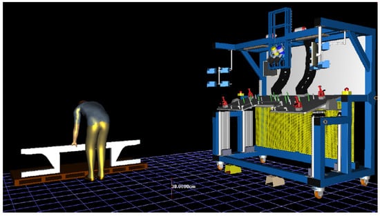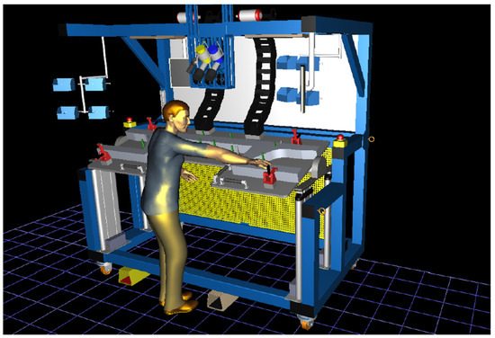 After creating the digital model of the workstation, a mannequin was placed at the workstation. Its purpose is to simulate the worker’s movements at the workstation and to perform work tasks. The software offers various mannequin options. The standard male represents a virtual model of an average male figure with a height of 174.2 cm and a weight of 77.7 kg. The software allows direct adjustment of height, weight, body type, and even ethnicity during the simulation. The standard female represents a virtual model of an average female figure with a height of 163 cm and a weight of 61.3 kg. The human model from the library enables loading a ready-made virtual human model directly from the software library. The custom model option allows the creation of a virtual human with user-defined parameters. For the purposes of this paper, the first option was selected. In the project, the worker’s parameters were adjusted to a height of 180 cm and a weight of 75 kg. Before starting the simulation, the position of the worker can be specified. The mannequin model was placed (Figure 6) in front of the machine.