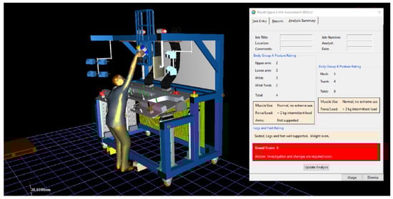 Figure 11 presents the results of the RULA analysis during the phase in which the worker retrieves the insertion tool. The overall score of the analysis reached a value of 6, which is considered very high and indicates a significant ergonomic risk. Such a high score suggests that the worker is in an inappropriate working position, which may lead to excessive strain on muscles and joints, thereby increasing the risk of injury. These results clearly signal the need for immediate measures to improve workstation ergonomics. The proposed changes should focus on optimizing the worker’s posture and reducing musculoskeletal strain.