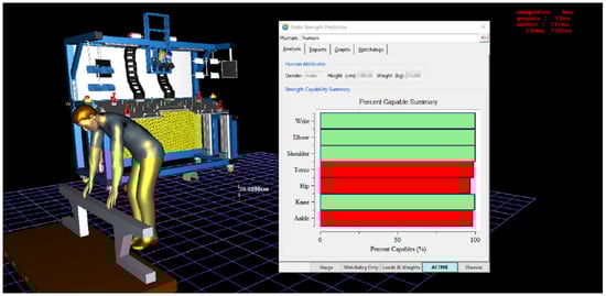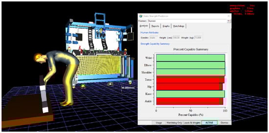 Figure 13 presents the results of the SSP analysis, in which the mannequin is depicted taking the component and carrying it to the workstation. The analytical perspective indicates that during this task, the torso, hip, and ankle are subjected to significant loading, which poses a risk to human health and necessitates urgent changes. This result provides a serious impetus to reassess working conditions and ergonomics in the workplace. It underscores the need to identify specific factors contributing to the load on these body parts and to propose measures to alleviate this strain.