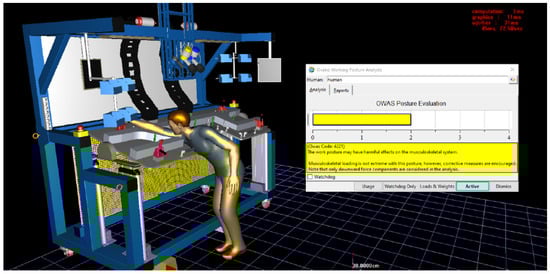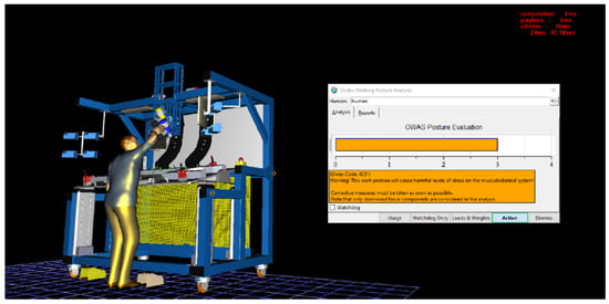 Figure 16 presents the results of the OWAS analysis when the worker opens the upper left clamp. The analysis determined that the working position may have harmful effects on the musculoskeletal system. It was found that the musculoskeletal load in this position is not extreme; however, compensatory measures were recommended. It should be noted that the analysis typically only considers force components directed downward. This analysis provides valuable information regarding working positions that may lead to excessive strain on the worker’s musculoskeletal system.