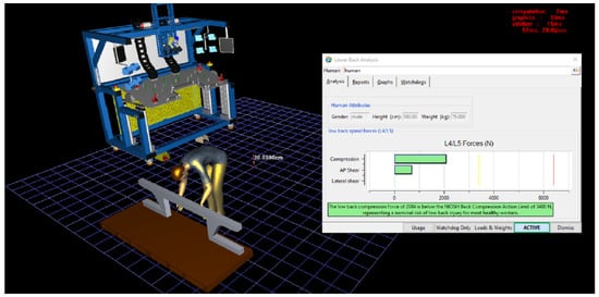 The results of the analysis during the placement of the component showed that the same body parts were subjected to load as when retrieving the component from the pallets. This conclusion is evident from the results of the analysis illustrated in Figure 14. Such a pattern of loading suggests that the worker is exposed to similar strain and risk of injury during both activities, which may lead to long-term health problems.