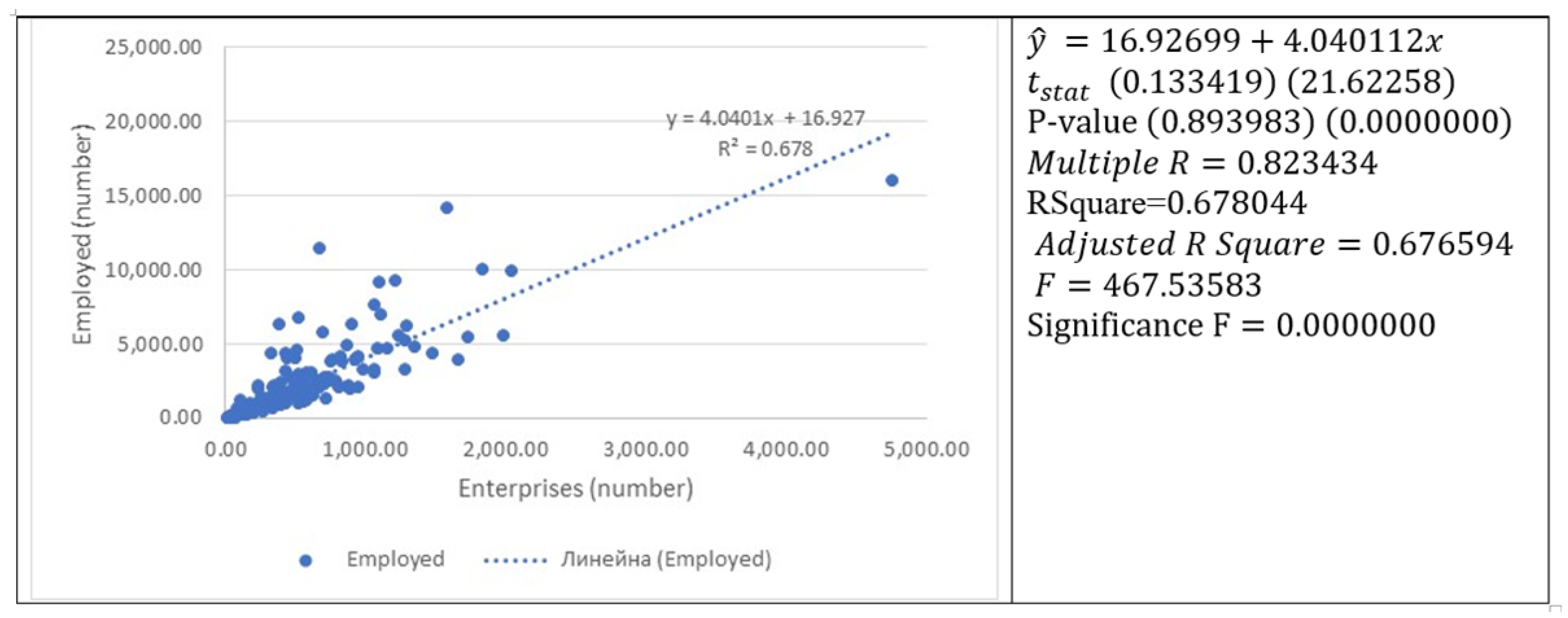 Figure 4. Characteristics of the dependence between the number of enterprises and the number of employees in municipalities with a population of up to 30,000 people. Source: National Statistical Institute and the Author’s calculations.