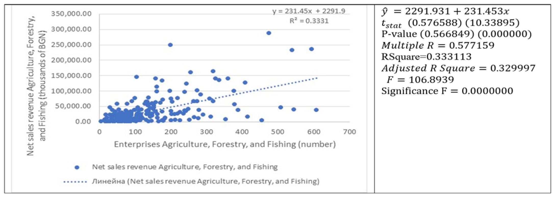 Figure 6. Characteristics of the dependence between the number of enterprises and the Net sales revenue in the “Agriculture, Forestry, and Fishing” sector in municipalities with a population of up to 30,000 people. Source: National Statistical Institute and the Author’s calculations.
