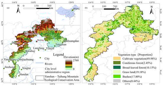 Geographical setting and vegetation types of the Yanshan–Taihang Mountain Ecological Conservation Zone (YTECZ). (a) illustrates the geographical location of the YTECZ within Northern China, highlighting its position relative to the Beijing–Tianjin–Hebei metropolitan region. (b) depicts the spatial distribution of dominant vegetation types across the study area.