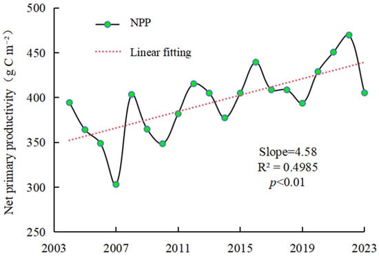 Temporal trajectory of annual vegetation NPP with linear regression trendline (2004–2023) in the YTECZ.