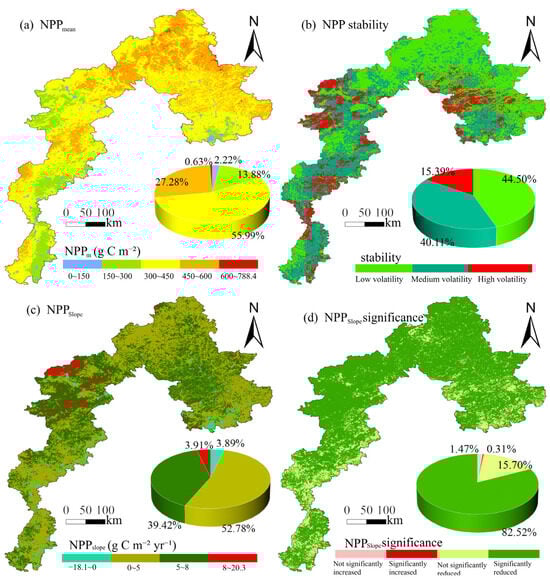 Vegetation forms the structural and functional backbone of terrestrial ecosystems, governing the exchange of water, carbon, and energy at the land–atmosphere interface. This regulatory capacity is fundamental to sustaining ecosystem services and supporting diverse human endeavors [1,2,3]. Net primary productivity (NPP) quantifies the rate of organic matter accumulation per unit area and time, calculated as the difference between photosynthetically fixed carbon and autotrophic respiration losses [4,5]. Serving as a critical metric for carbon source/sink identification, vegetation NPP provides essential insights into plant growth dynamics, ecosystem carbon sequestration potential, and ecological quality assessment [6,7,8]. Climate change and anthropogenic activities constitute pivotal drivers governing NPP dynamics [9]. Meteorological variables (e.g., temperature, precipitation) modulate NPP magnitude by regulating physiological plant processes, whereas ecological restoration initiatives—including afforestation [10], cropland-to-forest/grassland conversion, and grazing exclusion—reshape NPP spatial patterns through vegetation community restructuring [11]. Concurrently, agricultural intensification practices such as irrigation, fertilization, and adoption of high-yield cultivars amplify localized NPP via enhanced photosynthetic efficiency in agroecosystems [12]. The combined pressures of climate change and anthropogenic activities are restructuring the net primary productivity (NPP) of global terrestrial ecosystems. Consequently, understanding the spatiotemporal patterns of NPP and conducting a rigorous attribution analysis are therefore critical steps for accurately diagnosing ecosystem health and informing policies that ensure regional ecological sustainability.