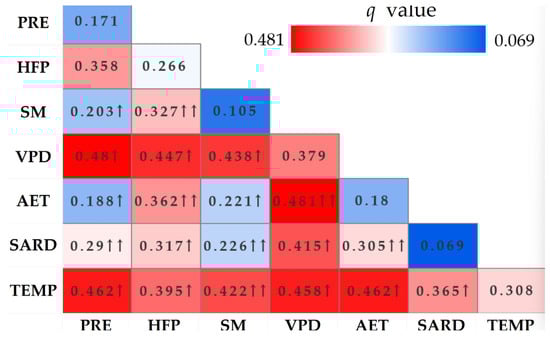 Interaction detection results between driving factors. The diagonal cells show the q-value of each individual factor. The off-diagonal cells represent the q-values after the interaction of two factors. The symbols ↑ and ↑↑ denote two-factor enhancement and non-linear enhancement, respectively. Warmer colors indicate stronger interactive explanatory power.
