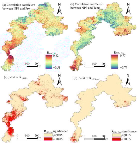 Spatial patterns of correlation between vegetation NPP and climatic factors in the YTECZ. (a) Correlation coefficients between NPP and precipitation; (b) correlation coefficients between NPP and temperature; (c) statistical significance of NPP–precipitation correlations (t-test, p < 0.05); (d) statistical significance of NPP–temperature correlations (t-test, p < 0.05).