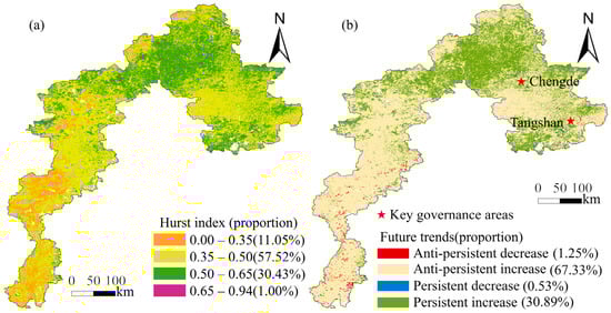Projected vegetation NPP trajectories: (a) spatial patterns of Hurst exponent, (b) integrated future trend classification based on Hurst–slope synergy.