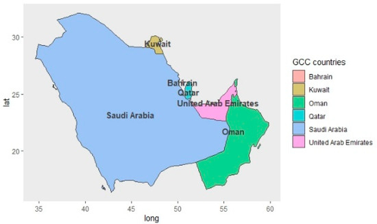 The member states of the Gulf Cooperation Council (GCC) play a critical role in understanding how economic growth, urbanization, and financial technologies (Fin-Tech) influence CO2 emissions. These countries are heavily reliant on hydrocarbons and rank among the highest in the world for per capita CO2 emissions, which poses significant challenges for their energy transition. Rapid economic growth and urbanization fueled by oil revenues and investments in infrastructure have led to increased energy consumption. Additionally, nations such as the United Arab Emirates, Bahrain, and Saudi Arabia are undergoing a rapid digital transformation through Fin-Tech, which is also affecting energy usage as digital infrastructure expands. Therefore, selecting GCC countries as the study area was due to their characteristics that make them suitable for analyzing the links between CO2 emissions and financial technology (cf. Figure 1).