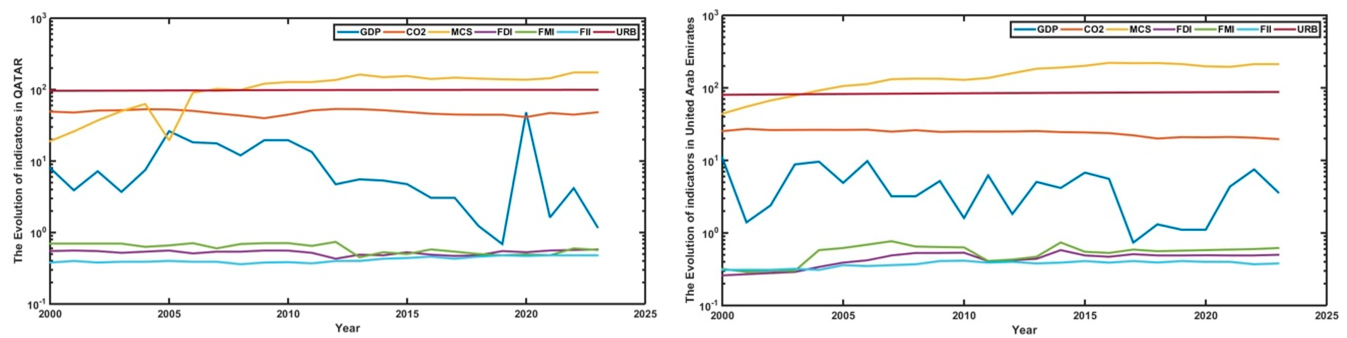 2 emissions in Qatar appear to be the most dynamic compared to those of the other countries, which suggests that the government lacks effective environmental protection policies. This situation exacerbates ecological sustainability challenges and consequently contributes to global warming.