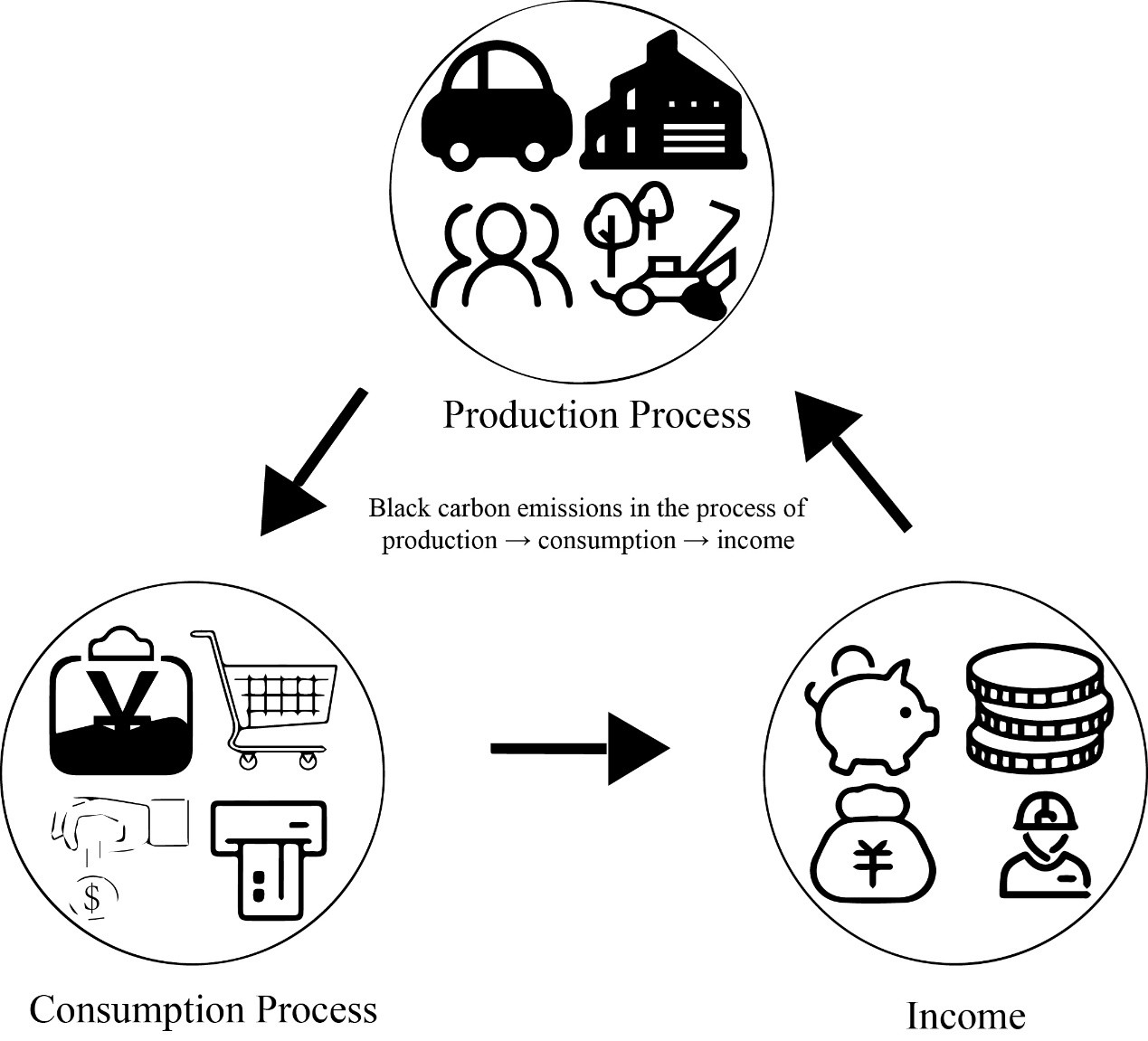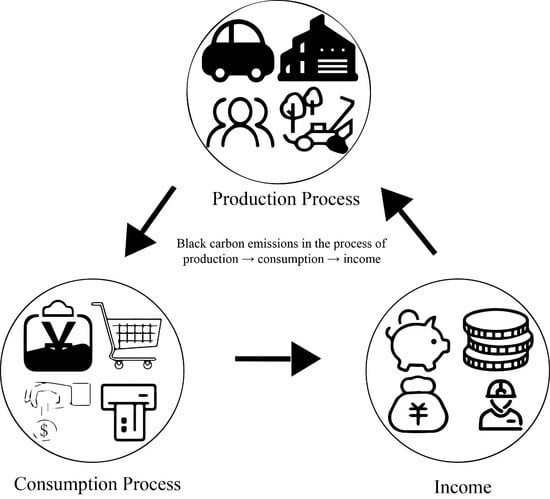 The integration of consumption-based emission analysis with input–output analysis (IOA) enables the assessment of environmental impacts across entire supply chains. Building on this approach, several studies have examined BC emissions in greater detail. Deng et al. [23] compiled BC emission inventories in China from 2002–2017 using energy consumption data and structural decomposition analysis, finding that urbanization and consumption patterns significantly influenced BC emissions. Meng et al. [25] investigated the drivers of BC emissions in four municipalities and quantified the contribution of key factors. Zhou et al. [19] examined the influence of atmospheric transmission and interprovincial trade on BC emissions in Hubei Province and proposed reduction measures. These studies collectively highlight the influence of socio-economic drivers on BC emissions and provide scientific foundations for policymaking. However, because the sectors of Chinese provinces are highly interconnected, effective decision-making requires consideration of the full cycle of production, circulation, distribution, and consumption. Identifying the supply chain linkages among economic sectors is therefore essential. The combination of structural path analysis (SPA) and IOA has been widely applied to identify critical emission and energy-use pathways and to trace emissions along these pathways [26,27]. While SPA-based studies have yielded valuable insights into the key sectors and critical paths driving PM2.5 and CO2 emissions, research specifically addressing BC is scarce. Fang et al. [28] applied SPA to reveal the critical pathways and main drivers of BC emissions in Sichuan Province, but such single-province studies cannot adequately capture the complex supply chain relationships that influence BC emissions across China. This limitation has hindered the development of more refined, region-specific mitigation strategies. Previous research has indicated that residential coal and biomass combustion are the primary sources of BC emissions in China and that significant disparities exist between urban and rural areas as well as among regions [29,30]. These differences stem from variations in income–expenditure ratios, consumption patterns, and geographic conditions. To design effective reduction policies, it is therefore necessary to understand the interactions between regional income flows and BC emissions from energy consumption.