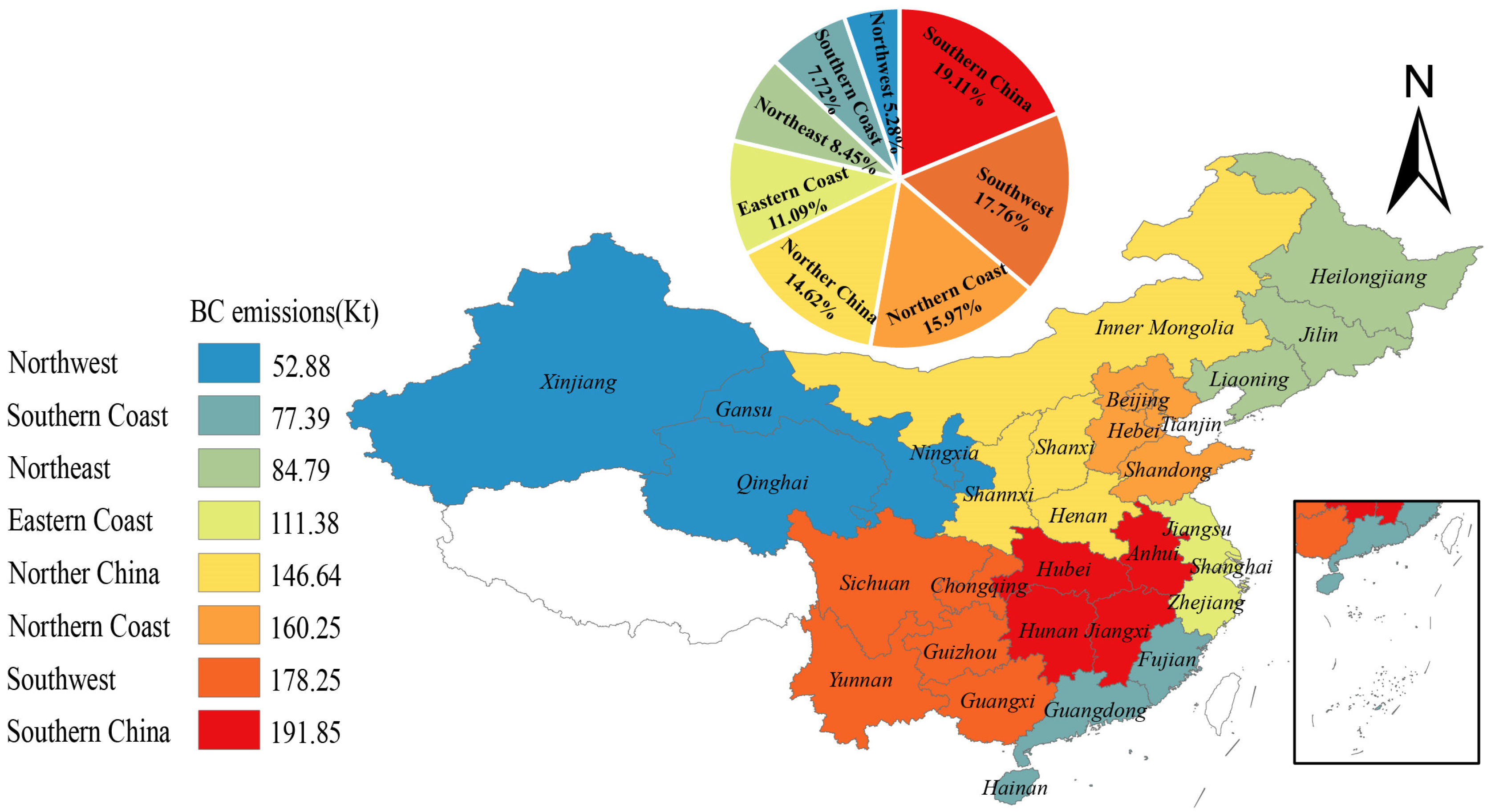 Considering the substantial disparities in labor income and economic development among Chinese provinces, we aggregated 30 provinces into eight regions based on major economic belts (Figure 1). In 2017, China’s total consumption-based BC emissions amounted to 1003.46 Kt. Overall, BC emissions in the less-developed inland regions exceeded those in the more-developed coastal areas. In terms of contribution, Southern China accounted for the largest share (19.11%), followed by the Southwest (17.76%) and the Northern Coast (15.96%). Moreover, economically advanced coastal provinces with higher per capita income and GDP—such as Tianjin (8.68 Kt), Beijing (19.66 Kt), and Shanghai (17.02 Kt)—recorded relatively low emissions, whereas Shandong (74.15 Kt), Hubei (63.81 Kt), and Henan (53.53 Kt), characterized by heavy industry or ongoing economic development, exhibited much higher BC emissions. We also compiled BC emission data for 2012. As shown in Figure S1 (see Supplementary Information), the Northern Coast accounted for the largest share of BC emissions that year, at 17.54%, followed by the Southwest (16.99%) and Northern China (16.92%). Following the launch of the Air Pollution Prevention and Control Action Plan—a landmark national initiative for atmospheric pollution abatement—in 2013, total BC emissions across our study regions decreased by 416 Kt by 2017. Northern China saw the most substantial reduction, at 90.26 Kt, followed by the Northern Coast (82.99 Kt) and the Southwest (66.05 Kt).