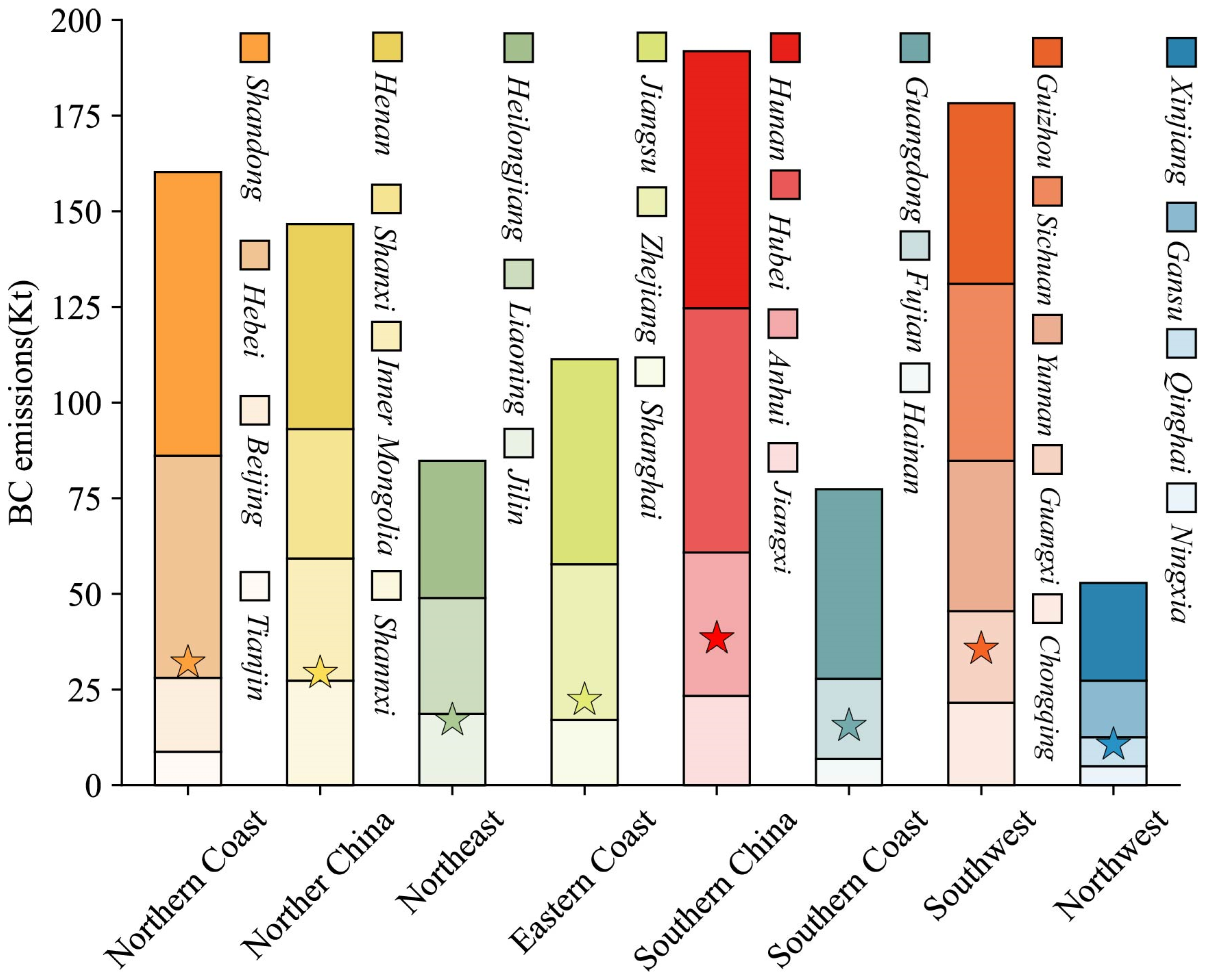 Figure 2. Consumption-based BC emissions in different Chinese provinces (where the ☆ represents the average emissions of the region).