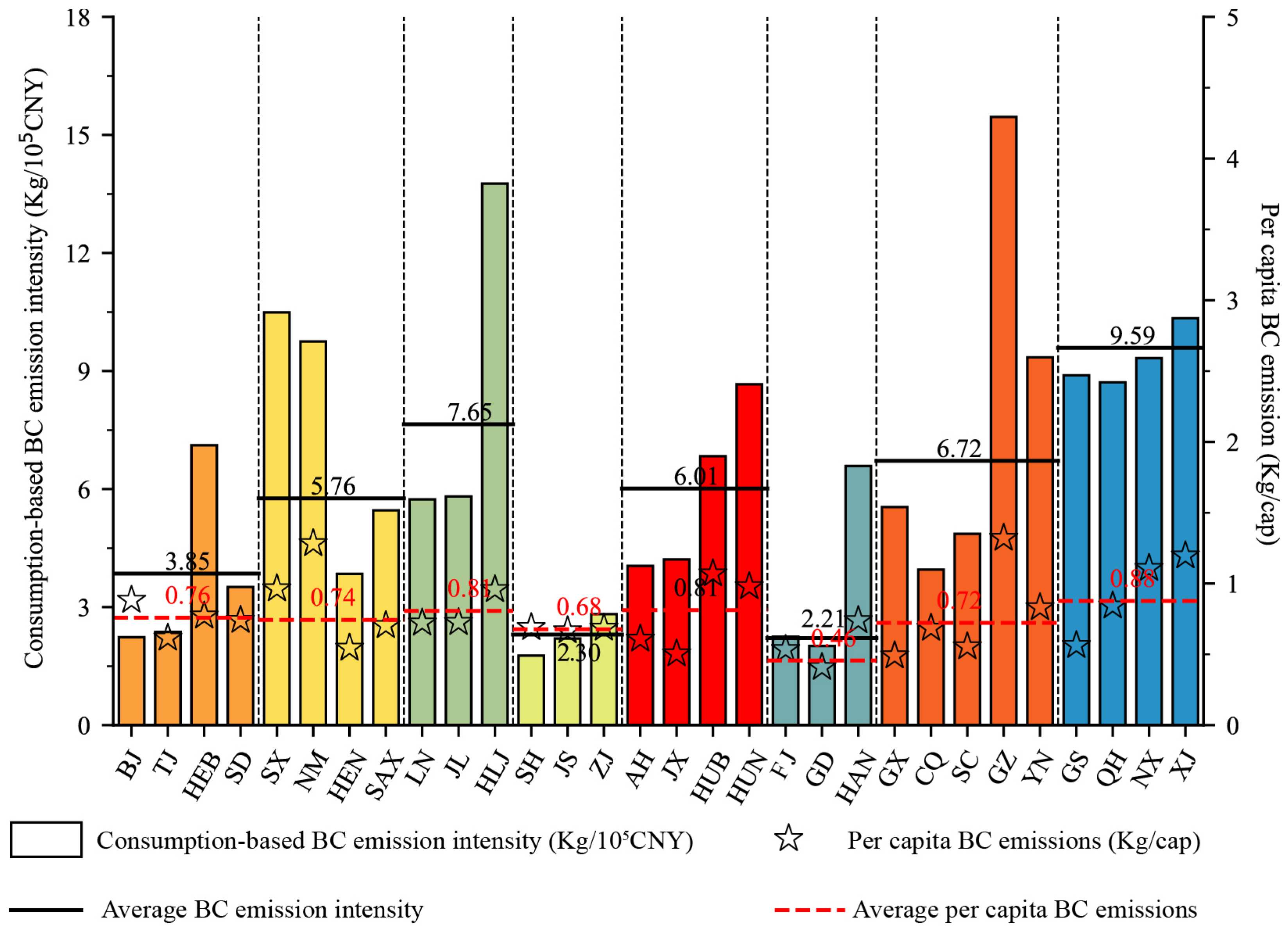 This study quantified residential BC emissions triggered by final demand across Chinese provinces and identified critical structural emission pathways within the consumption–production–income nexus. Except for the Eastern provinces, average BC emission intensity and per capita emissions were relatively high in other regions, particularly in central and western provinces such as Shanxi, Ningxia, and Inner Mongolia, indicating substantial emission reduction potential.